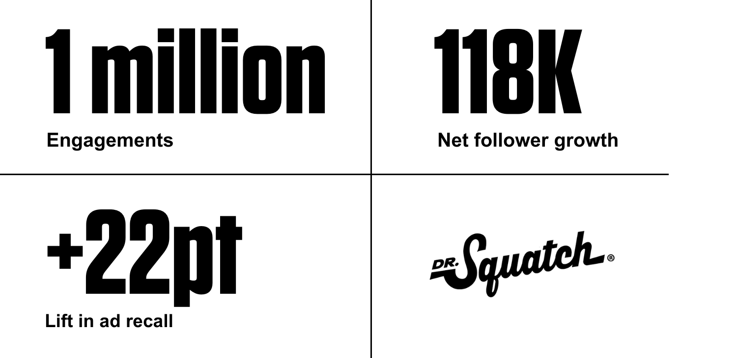 The campaign drove a massive ad recall and enthusiastic engagement, with comments ranging from “I gotta order every flavor of Dr. Squatch now” to “this is a legit ad?? This is fantastic. Brilliant marketing. A+.” The stand-up series achieved: