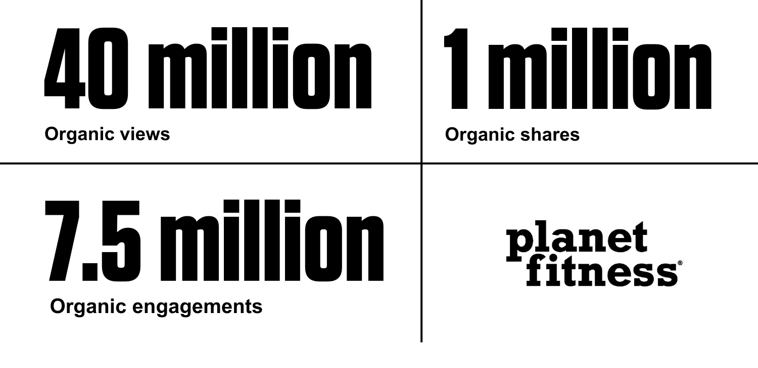 Across three posts, the fandom showed up in force, flooding the comments, sharing the moment, and celebrating Neace’s rise from internet favorite to Times Square star. By collaborating with an internet hero, Planet Fitness saw enormous virality and cultural relevance for the brand. The content delivered record-breaking organic performance for Planet Fitness with 40M+ views, 7.5M engagements, 26K new followers, and an astonishing ONE MILLION shares.